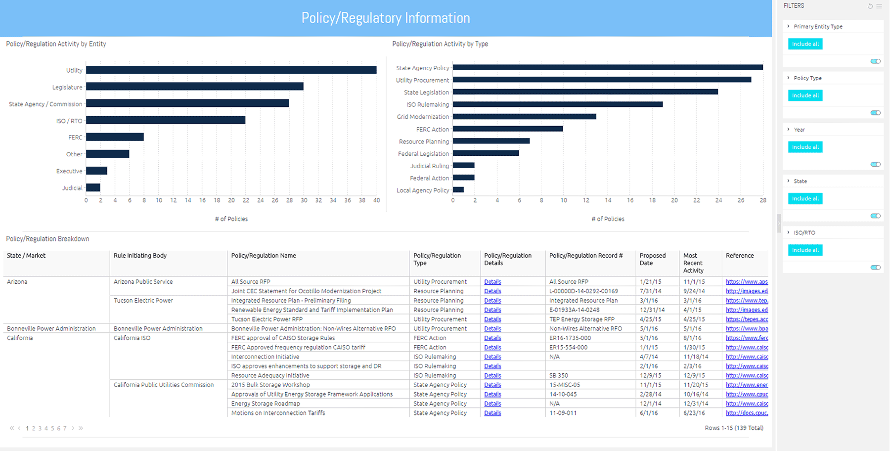 Detailed tracking of policies and regulation at the federal, state and ISO level.